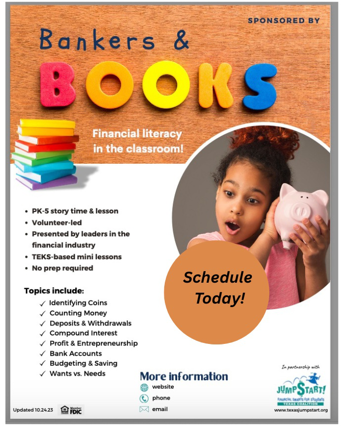 Our FREE Bankers & Books Program allows leaders in the financial industry to share their knowledge of and enthusiasm for promoting financial education to school children across Texas. Through standards-based mini-lessons, volunteers cover such topics as: saving and spending, counting money, identifying coins, compound interest, entrepreneurship, and so much more.